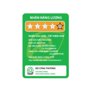– Nhãn năng lượng: 5 sao (hiệu suất năng lượng 5.39), tiêu thụ điện năng ~1.03 kW/h.